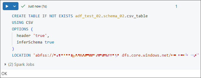 ①ストレージアカウント上のCSVファイルに接続する外部テーブルを作成します。