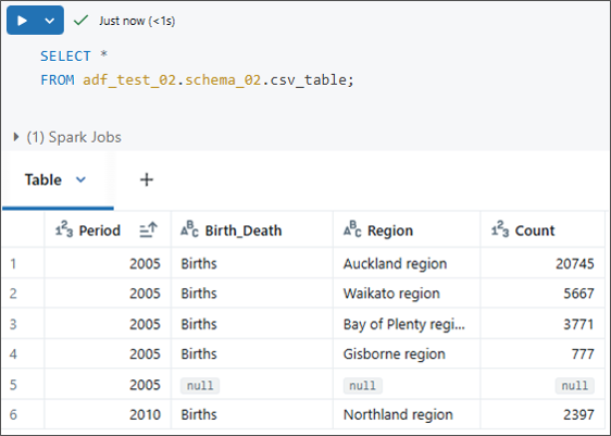 そして、両方のノートブックで同時に「csv_table」に対して「SELECT」を実行すると、ストレージアカウントからのデータがテーブルに反映されている結果が確認できます。