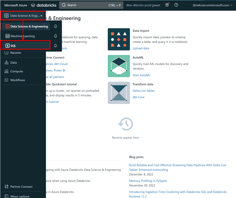Databricks ロゴ の下にあるアイコンをクリックし、3つのペルソナの中から [SQL] をクリックします。