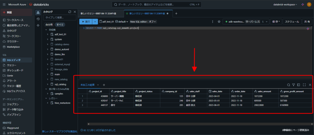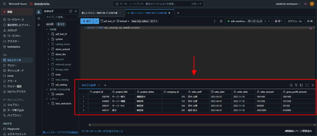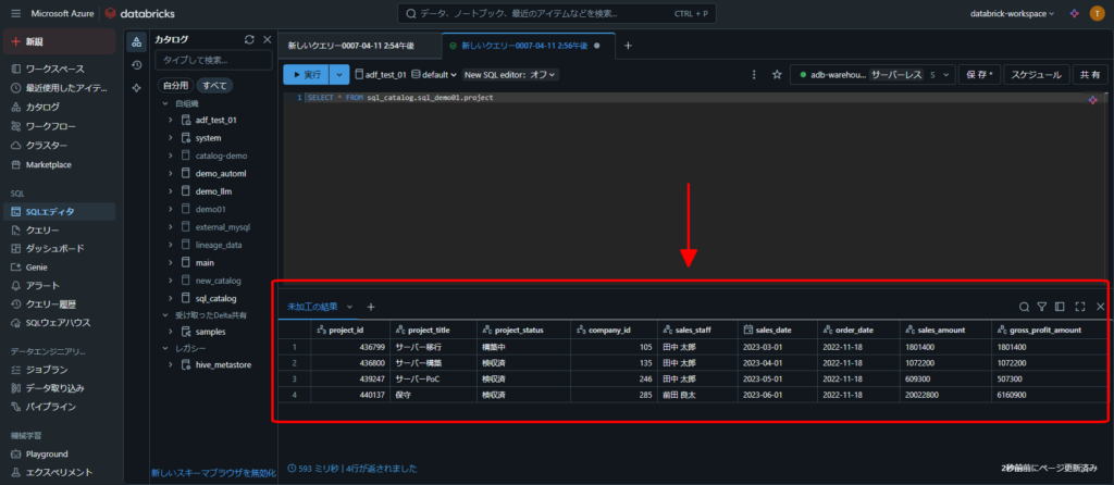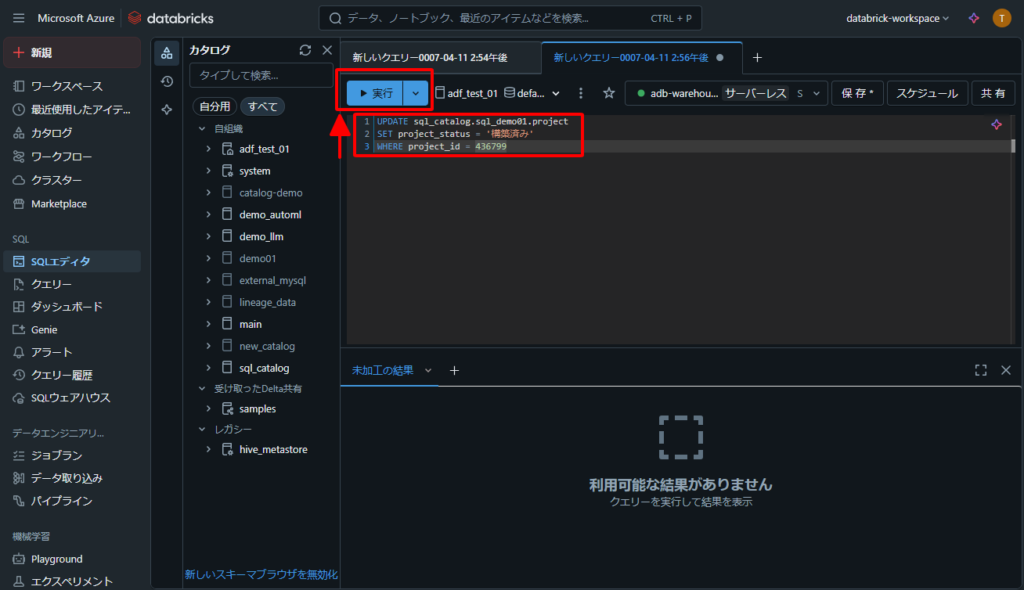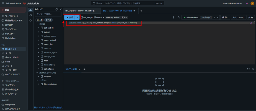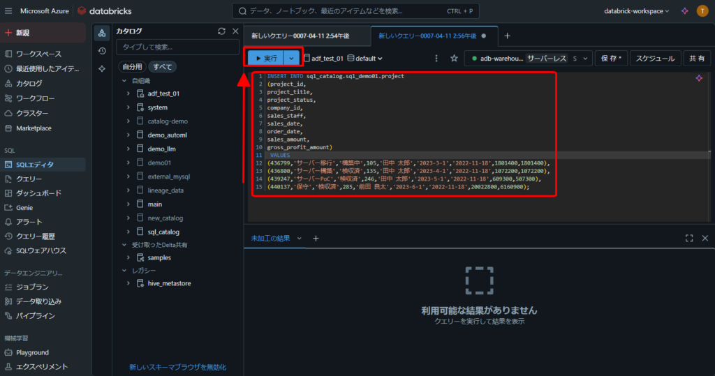 2.Azure Databricks でSQLクエリを実行する手順(データ挿入、データ更新、データ削除)