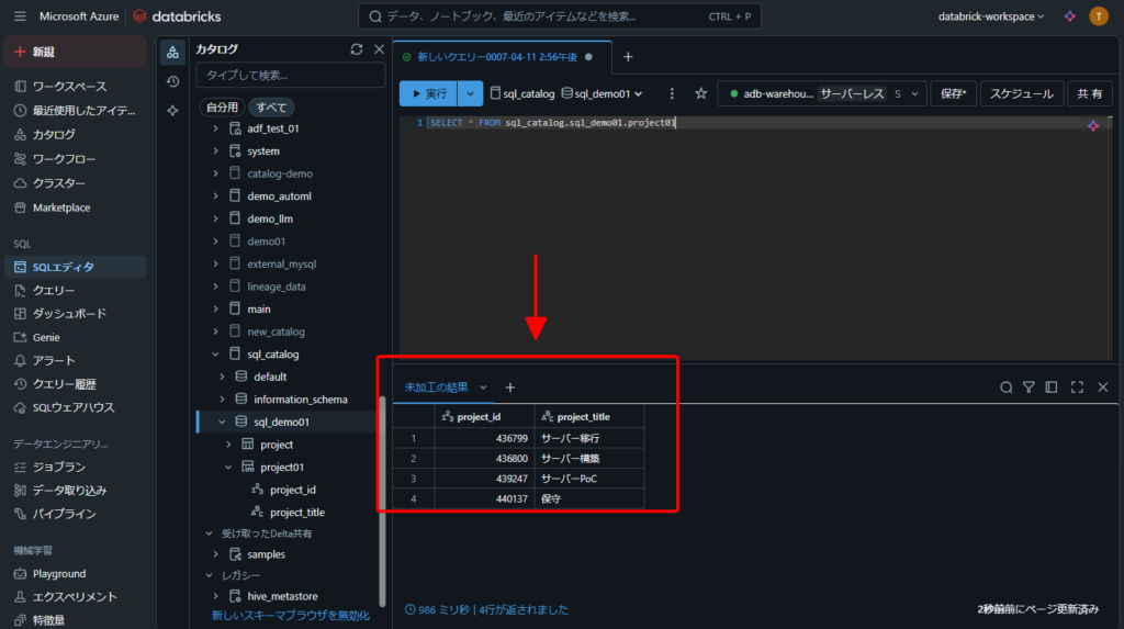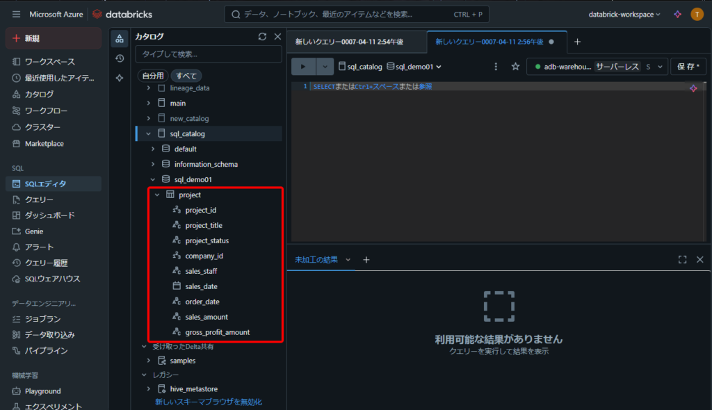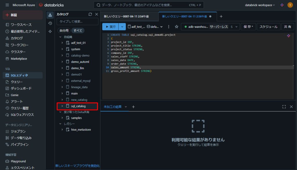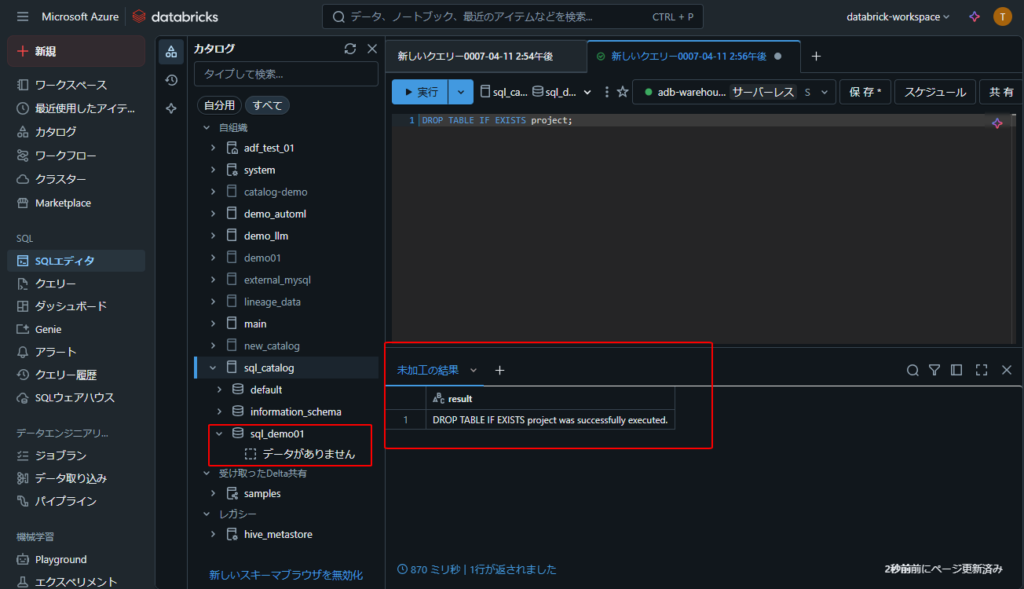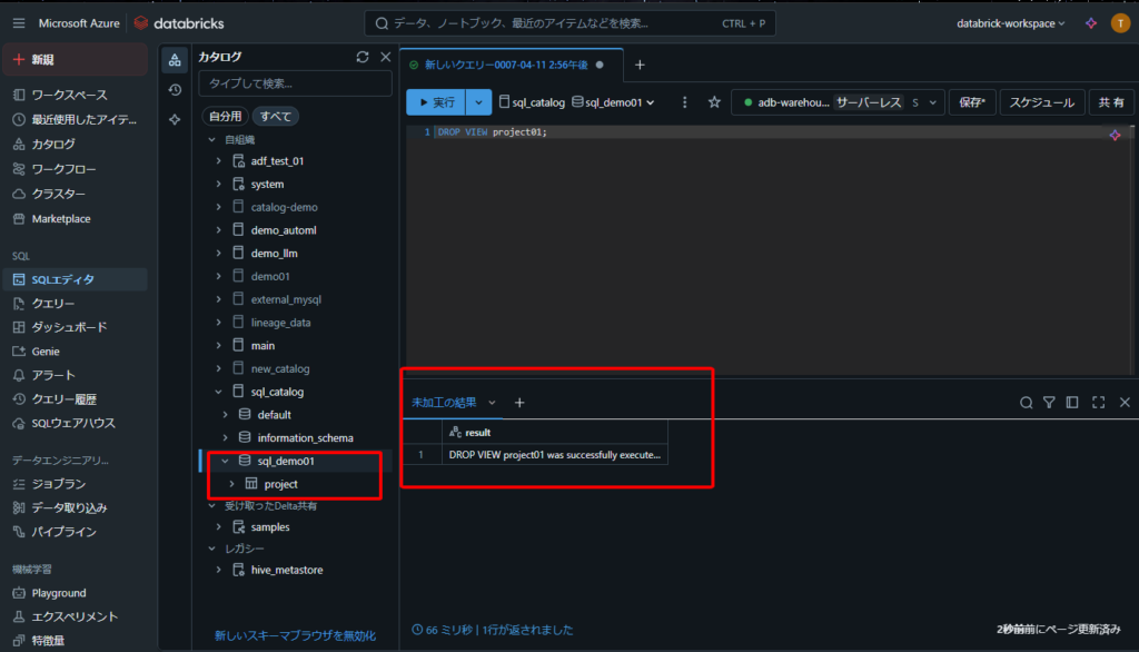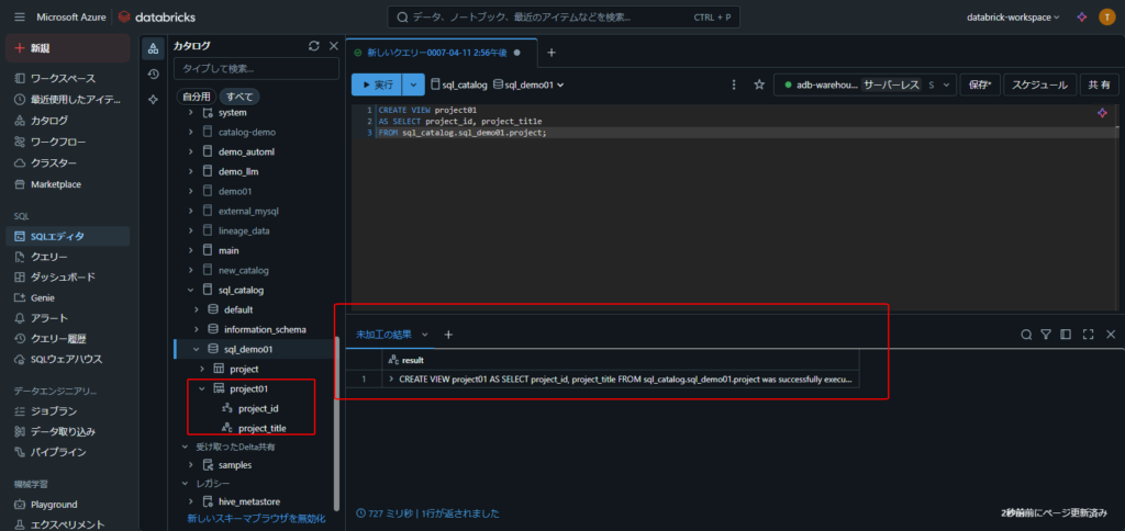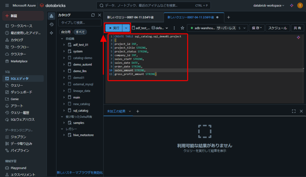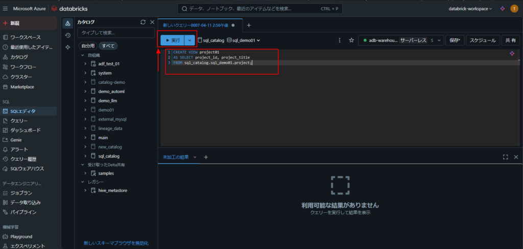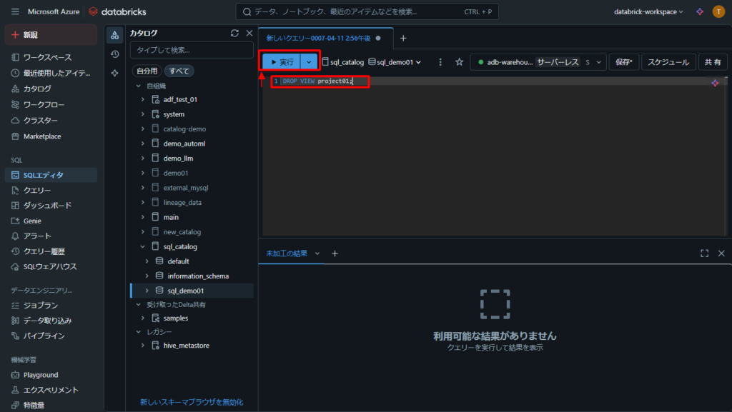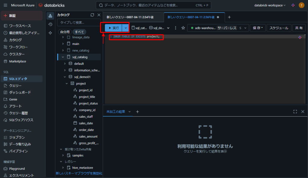 3.Azure Databricks でSQLクエリを実行する手順(テーブル作成、テーブル削除、ビュー作成、ビュー削除)