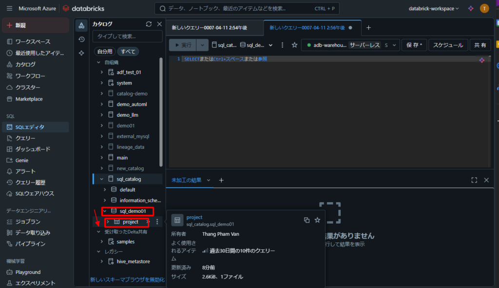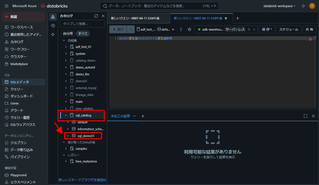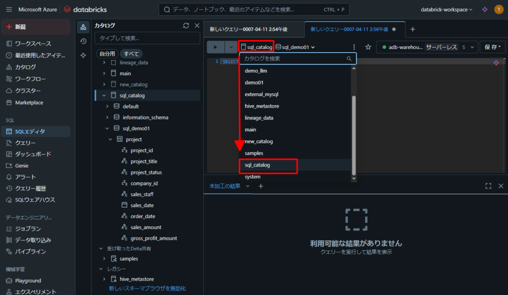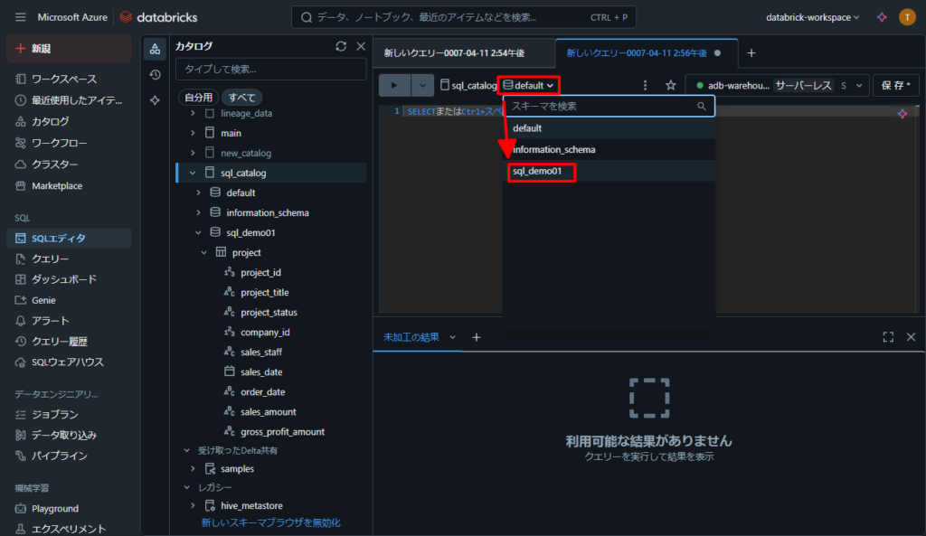 エディター領域でカタログとスキーマを変更することで、コード記述時にテーブル名の指定を簡素化することが可能です。