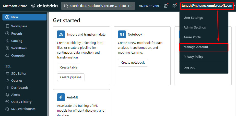 • 方法2:ワークスペース画面右上のユーザ名から、「Manage Account」をクリックします。