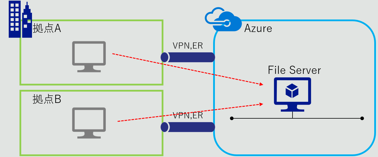 ファイルサーバーがオンプレ内ではなくクラウド上に存在しているため、点在する各拠点から接続することが可能です。VPNやExpressRouteなどを用いることで安全にアクセスが可能であり、オンプレと変わらない利用が可能です。また、オフィスの移転などの拠点移動のたびに大量のデータを移行する必要もなくなります。