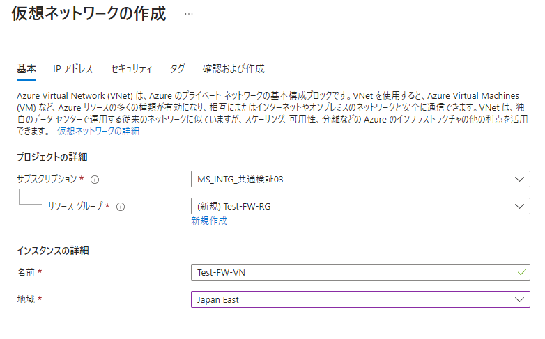 仮想ネットワーク:Hub-VN(Test-FW-RG)