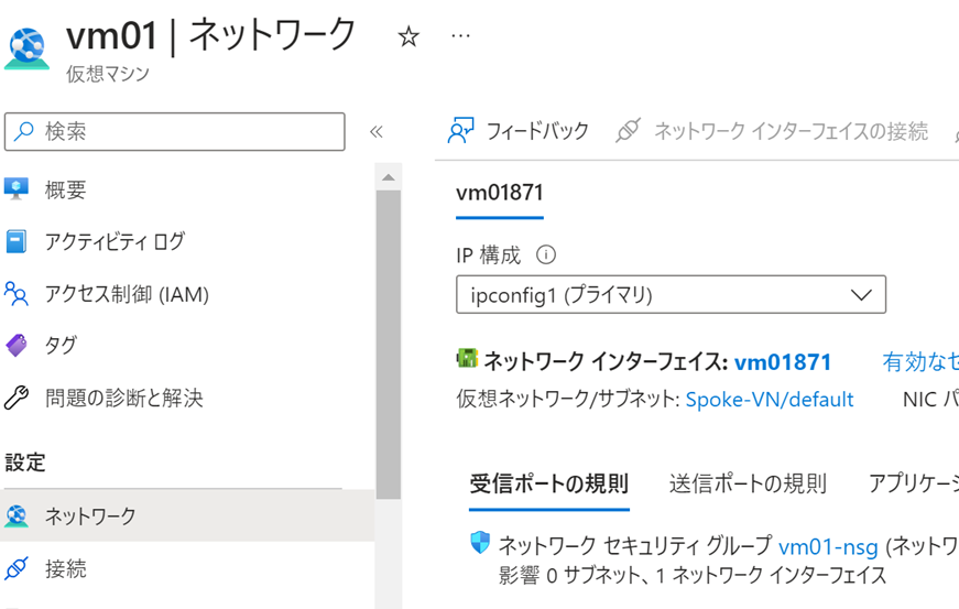 作成したHubとSpokeの仮想ネットワークはデフォルトだと接続されておらず疎通できません。