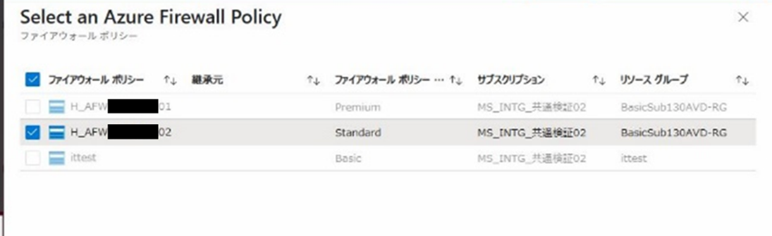② ダウングレードしたい対象のAzure Firewall に紐づけられているAzure Firewall Premium ポリシーを①で作成したStandardに切り替える。
