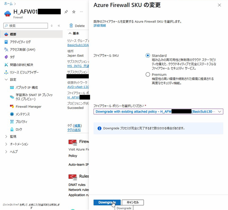 では、実際に Azure Firewall の SKU をダウングレードしてみましょう。後述しますが、ダウングレード作業中には環境条件に応じて通信影響が発生するため、適切な作業時間の検討が必要です。