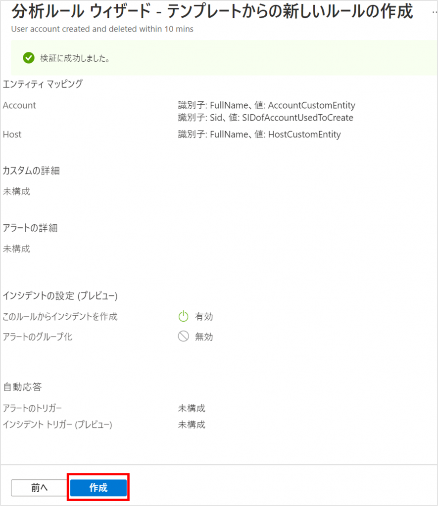 こちらの分析ルールでは、10分以内にユーザーアカウントの作成→削除イベントが検知された際にアラートを発報する内容となっています。