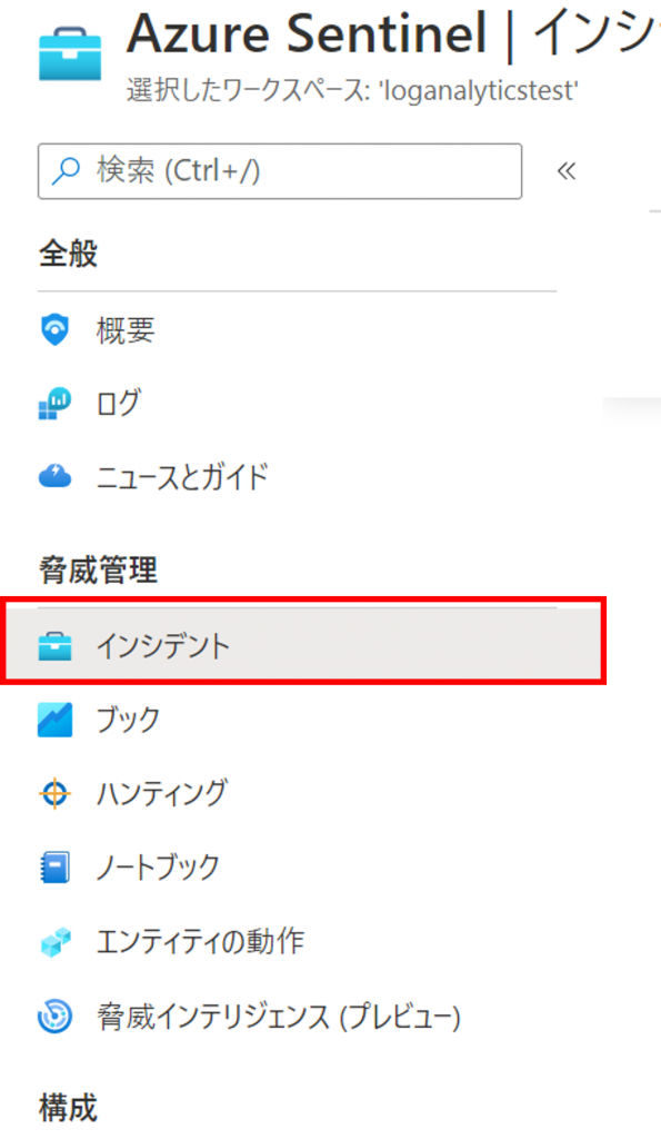 Microsoft Sentinel のメニューから[インシデント]をクリックします。