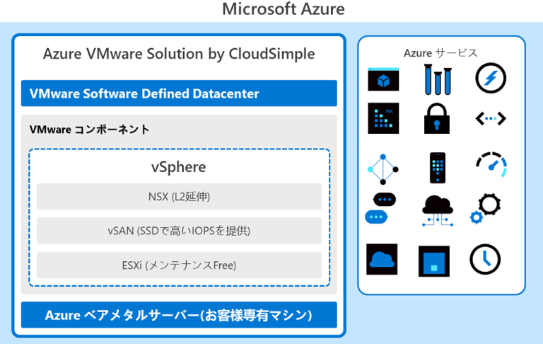 Azure VMware Solutionは、Microsoftが提供するクラウド「Microsoft Azure」で提供されるサービスの1つで、Microsoft Azureのデータセンターで提供されるフルマネージドなVMware vSphere環境を数クリックで使えるサービスです。