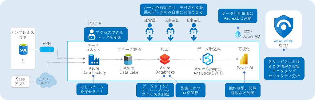 それでは、使いたい時、使いたいデータを分析に使える環境と、不正なアクセスからデータを安全に管理するためにどうすればよいのか、以下の図ではAzureサービスを活用することで強化できる例を紹介しています。