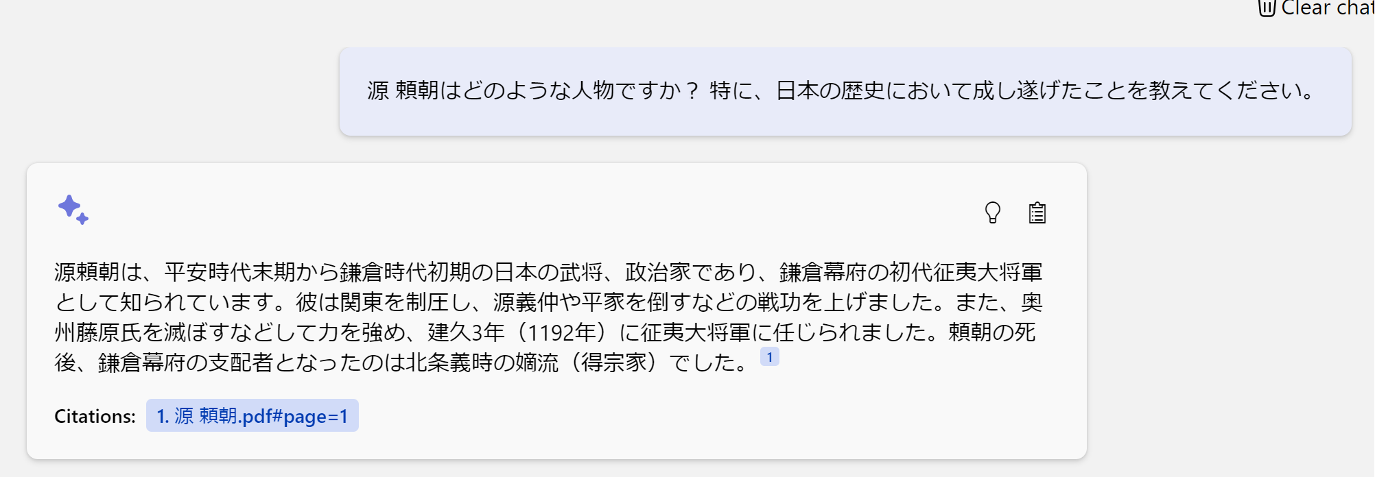 「源 頼朝が成し遂げたこと」という文章の意味を理解して、数十ページにおよぶPDFから正確に回答されています。