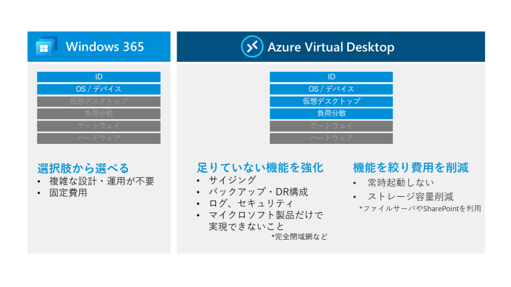 Windows 365では仮想デスクトップ以下の領域をMicrosoftがすべて管理しますので、複雑な設計や運用は不要です。一方で、AVDでは仮想デスクトップや負荷分散まで自社で管理する必要がありますが、その分バックアップやDR構成、ログ・セキュリティ管理など様々なカスタマイズが可能です。