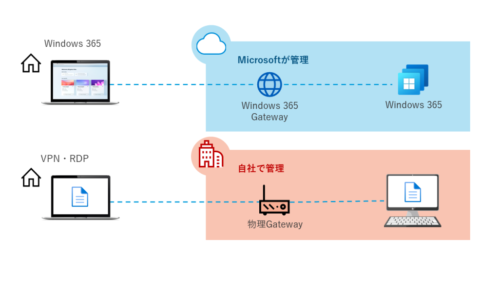 一方で、物理PCからVPNなどで社内にアクセスする場合は、個別にゲートウェイの設置が必要ですので、Windows 365 ですと管理負荷を下げることができます。