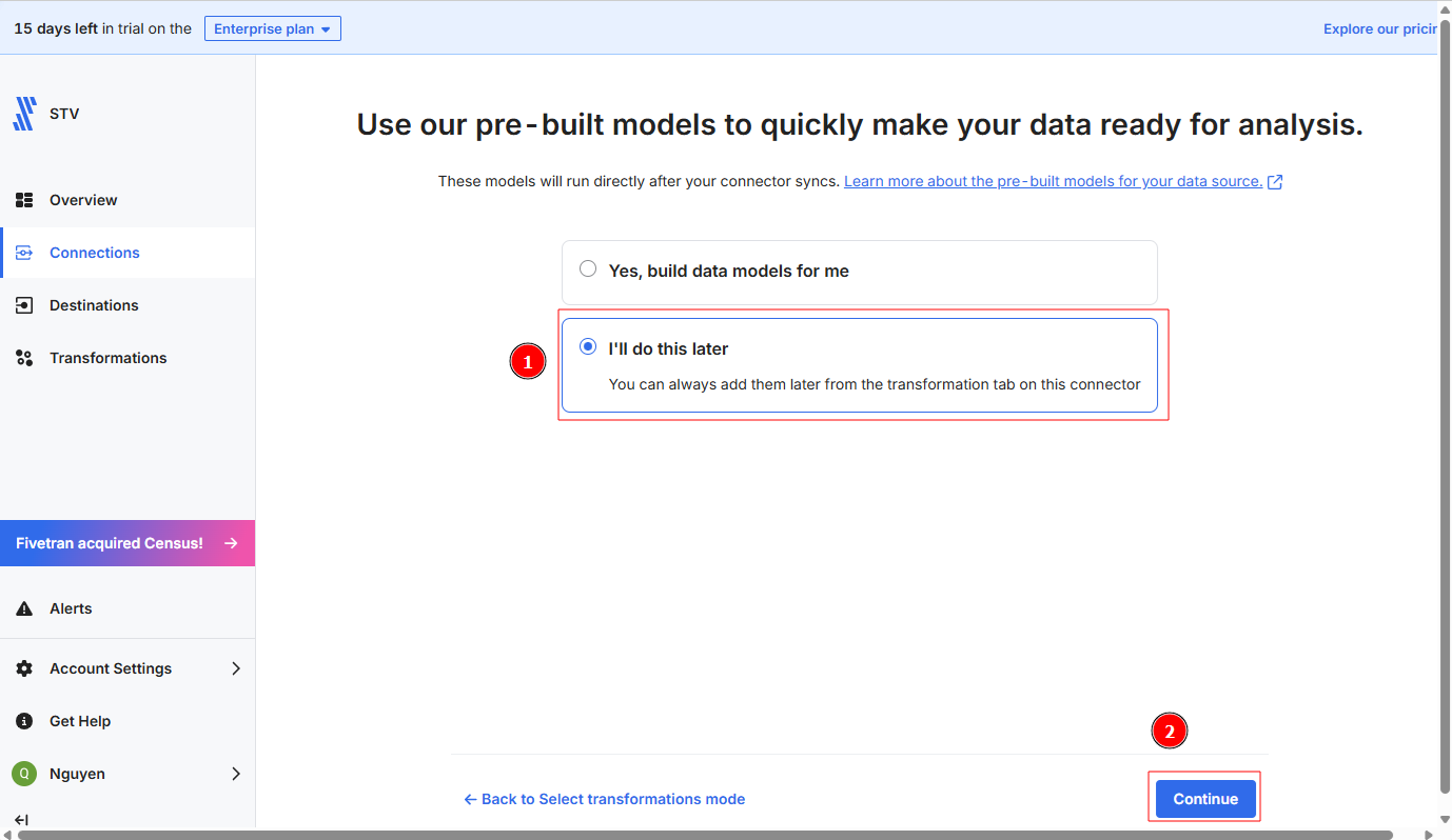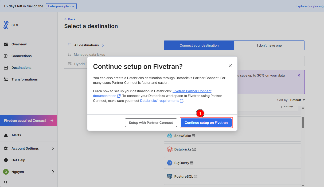 ③ 「Continue setup on Fivetran」を選択します。