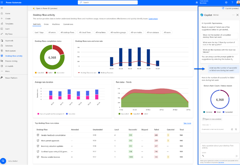 Copilotを使用して、自動化のステータスやパフォーマンスを簡単に分析できます。