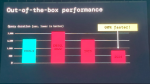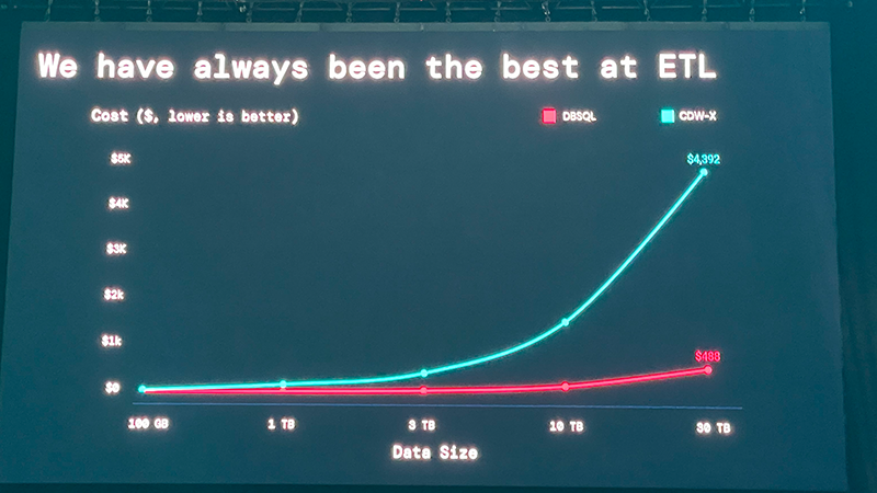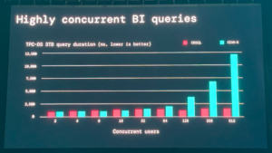 某雪印のCDWHとTPC-DSのベンチマークで比較すると性能差は顕著で30TBのETL処理ならコストは10倍、1TBでも2倍レベルの差がある、何もチューニング市内巣の状態で計算処理は60%高速、BIのユースケースでたとえば512人が同時接続すると10倍の費用差が出てくると発表している。(なかなか露骨で強いライバル心を感じます)