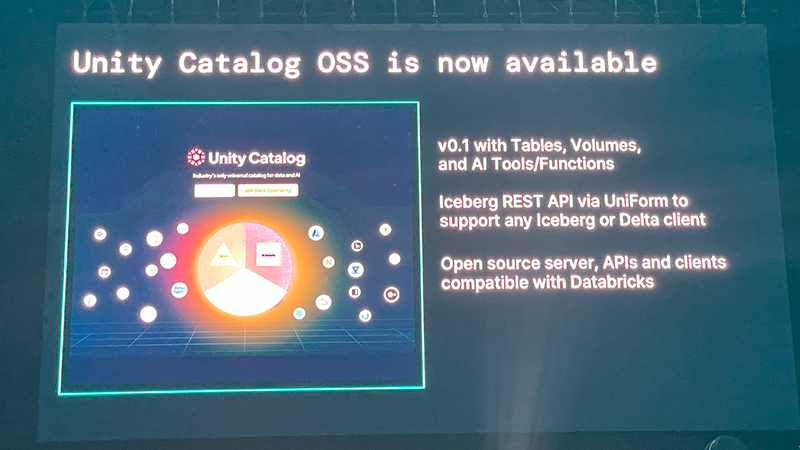 オンプレやDatabricks以外のデータでも、Unity Catolgで管理が可能となる。デルタシェアリングなど、Unity Catalogの機能も利用でき、今後データ管理の基準として拡大することが期待される。セッションのなかで、リアルタイムにUnity Catalog OSSのバージョン1.0をリリーするパフォーマンスを実施し、観覧車から特別に大きな歓声が上がっていた。