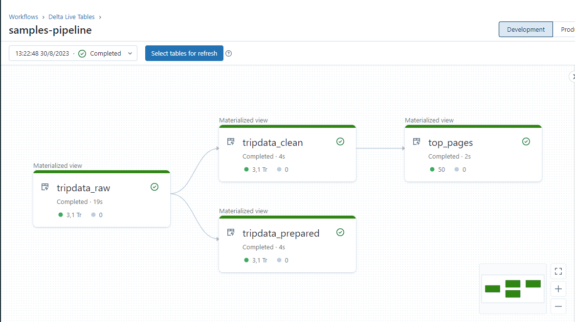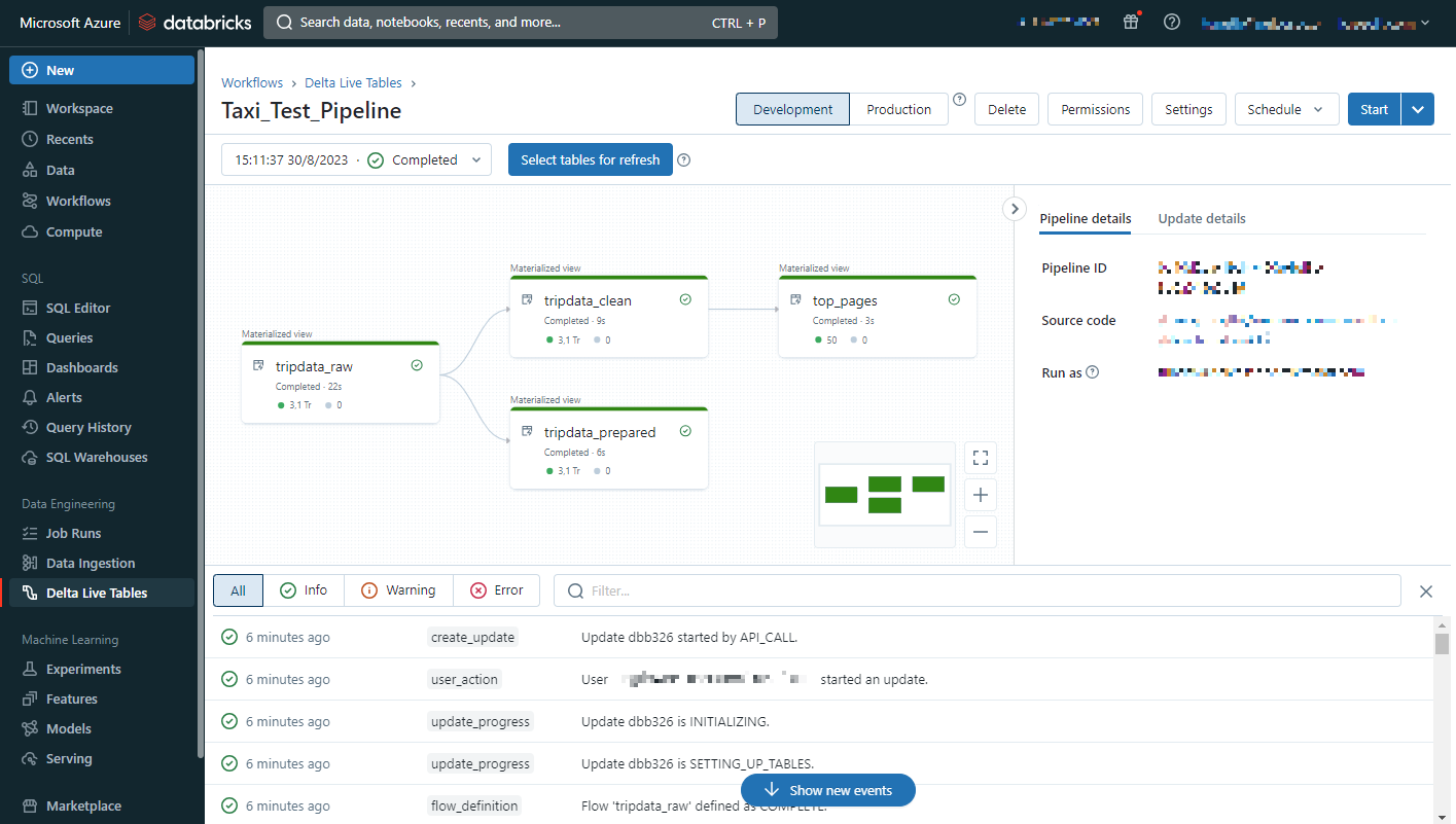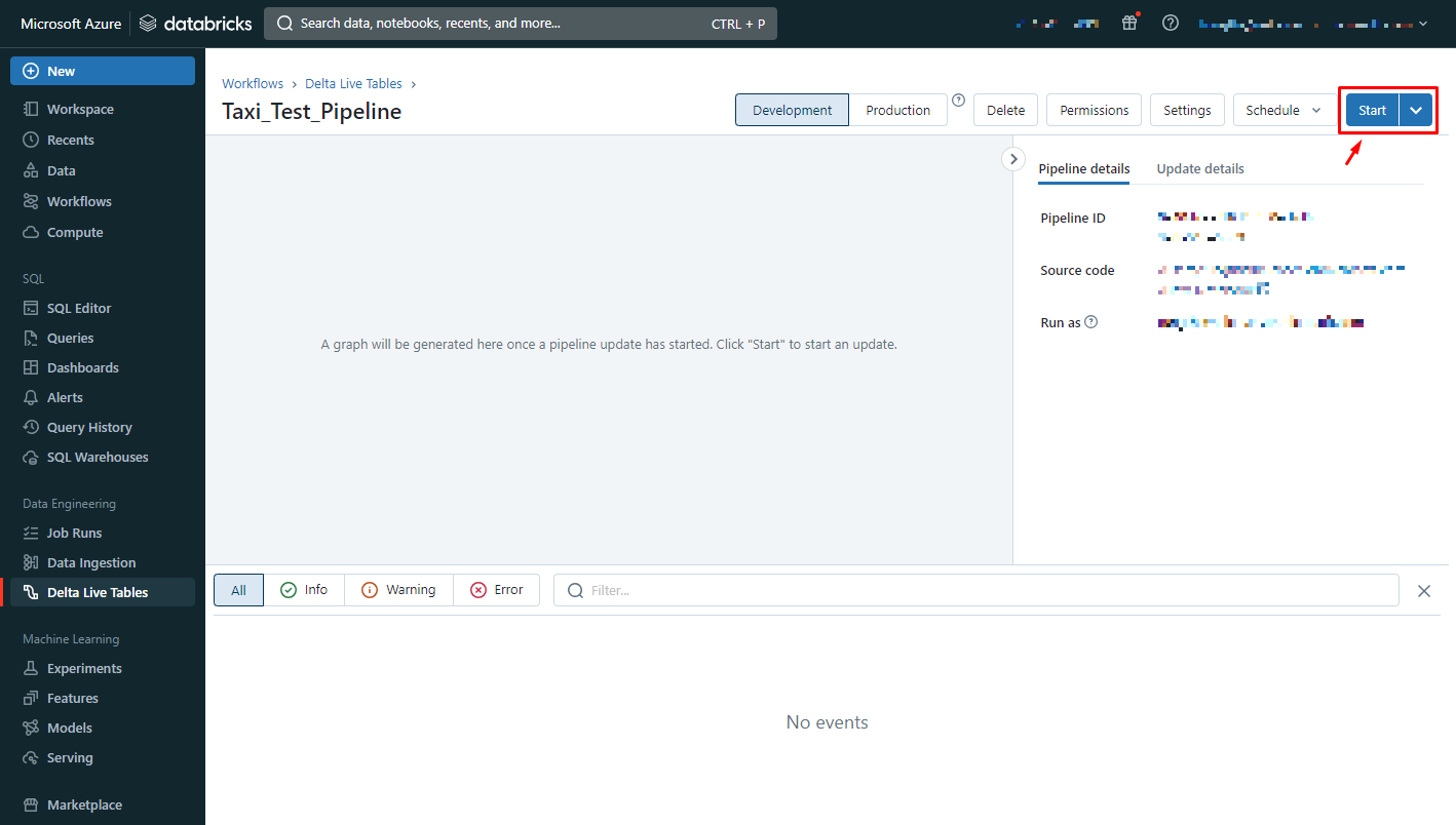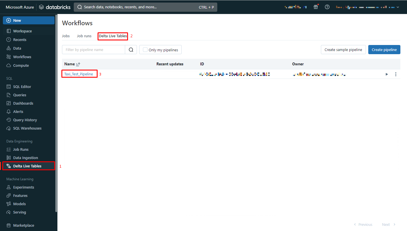 ①Delta Live Tables > Delta Live Tables > 作成したパイプラインをクリックします。