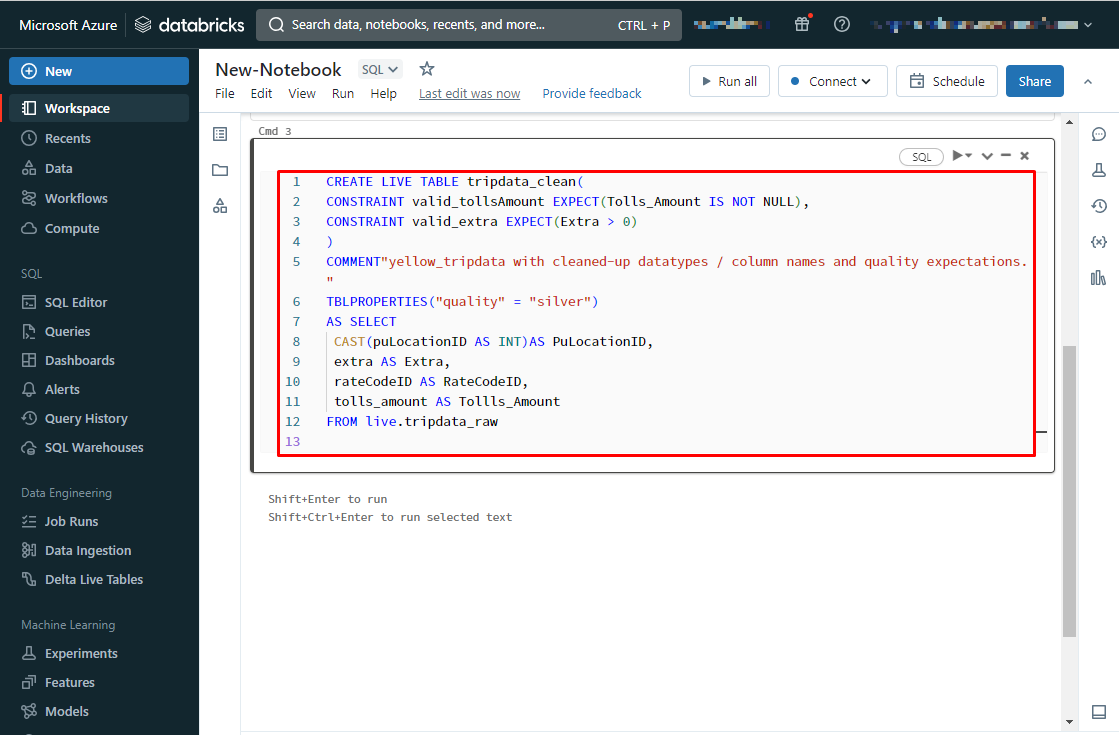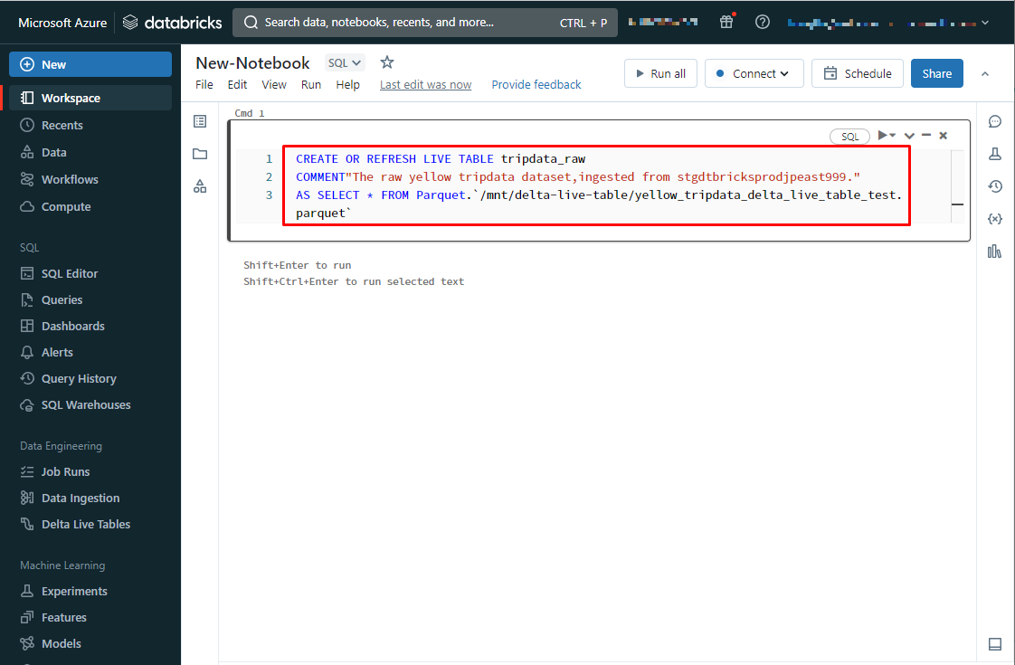 CREATE OR REFRESH LIVE TABLE tripdata_raw COMMENT"The raw yellow tripdata dataset,ingested from stgdtbricksprodjpeast999." AS SELECT * FROM Parquet.`/mnt/delta-live-table/yellow_tripdata_delta_live_table_test.parquet` |