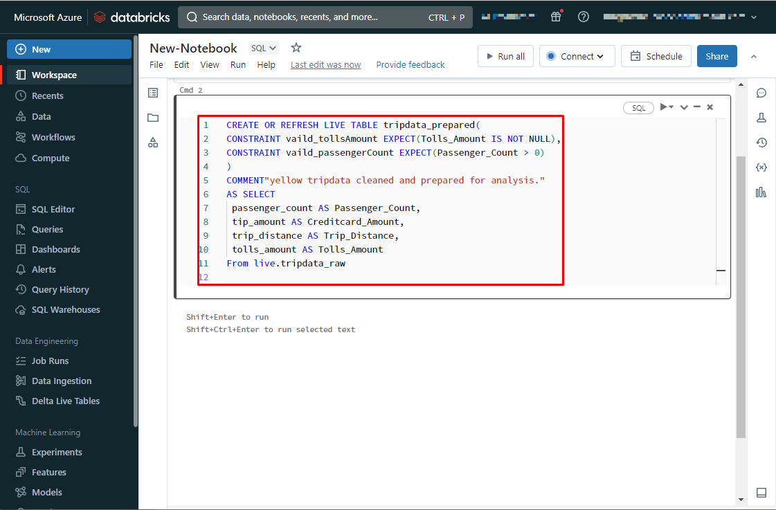 CREATE OR REFRESH LIVE TABLE tripdata_prepared( CONSTRAINT vaild_tollsAmount EXPECT(Tolls_Amount IS NOT NULL), CONSTRAINT vaild_passengerCount EXPECT(Passenger_Count > 0) ) COMMENT"yellow tripdata cleaned and prepared for analysis." AS SELECT passenger_count AS Passenger_Count, tip_amount AS Creditcard_Amount, trip_distance AS Trip_Distance, tolls_amount AS Tolls_Amount From live.tripdata_raw |