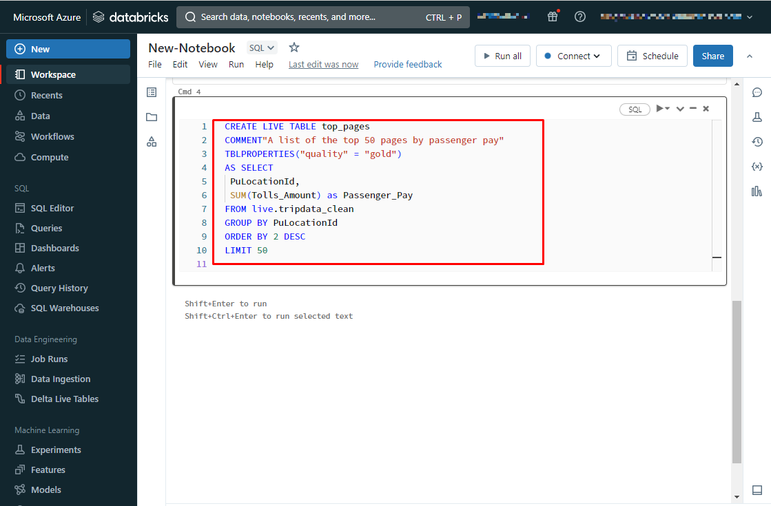 CREATE LIVE TABLE top_pages COMMENT"A list of the top 50 pages by passenger pay" TBLPROPERTIES("quality" = "gold") AS SELECT PuLocationId, SUM(Tolls_Amount) as Passenger_Pay FROM live.tripdata_clean GROUP BY PuLocationId ORDER BY 2 DESC LIMIT 50 |