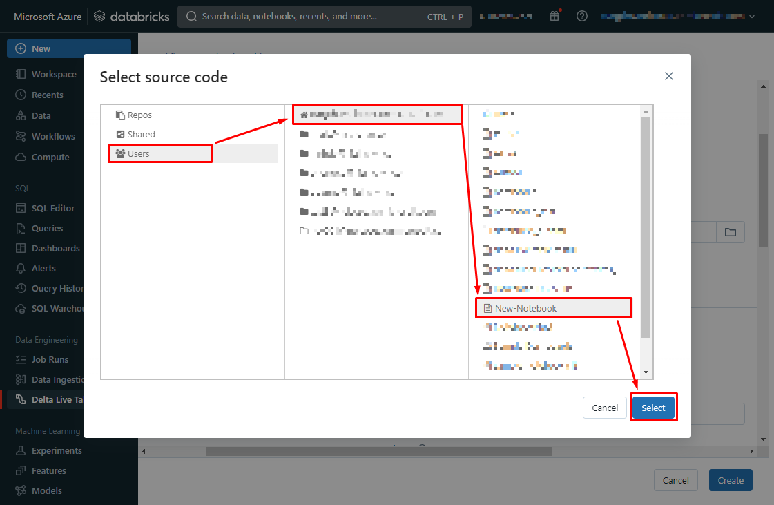 ③Workspace > Workspace > Users >自分のユーザー名 > 使用するノートブック を選択します。