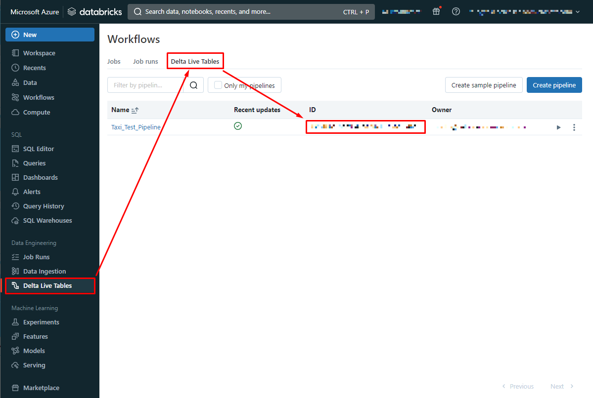 ① Delta Live Tables > Delta Live Tables > 該当のパイプラインを選択します。