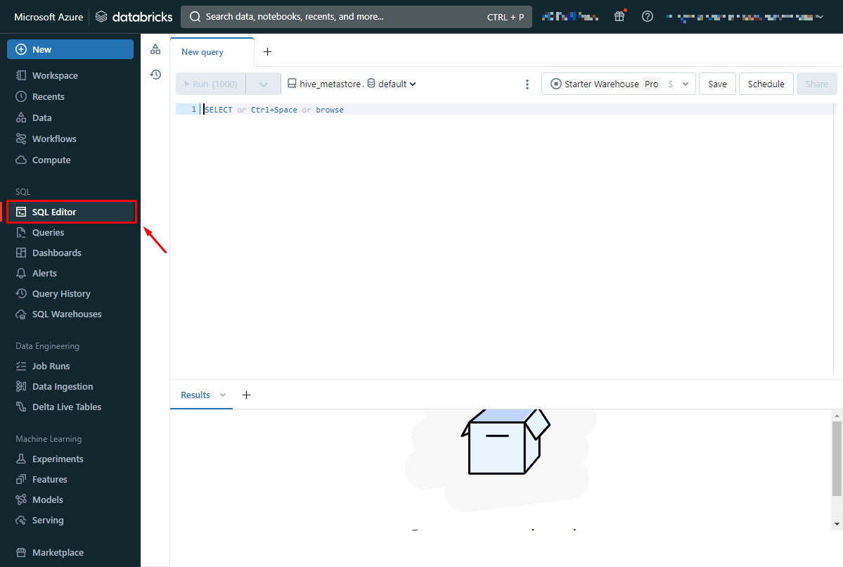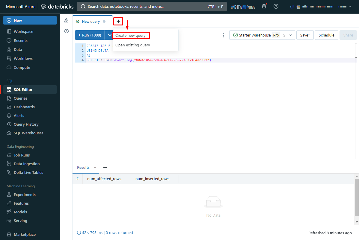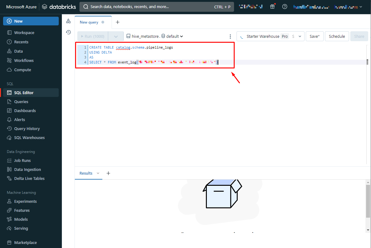 ② New queryにログテーブルをUnity Catalogに登録するコマンドを入力します。