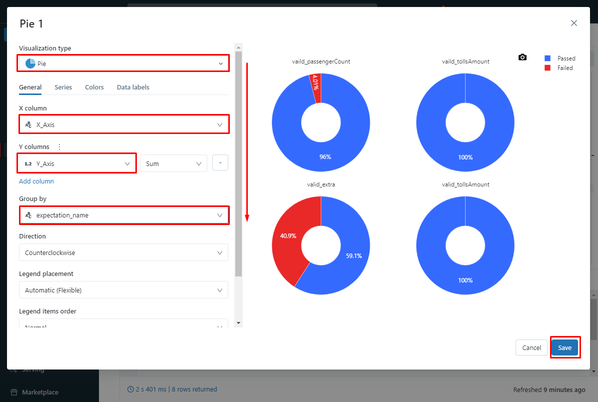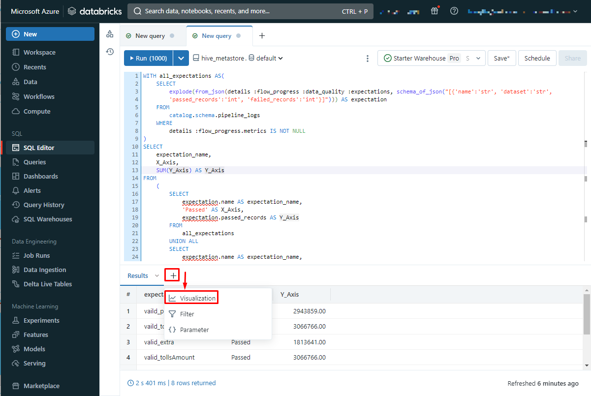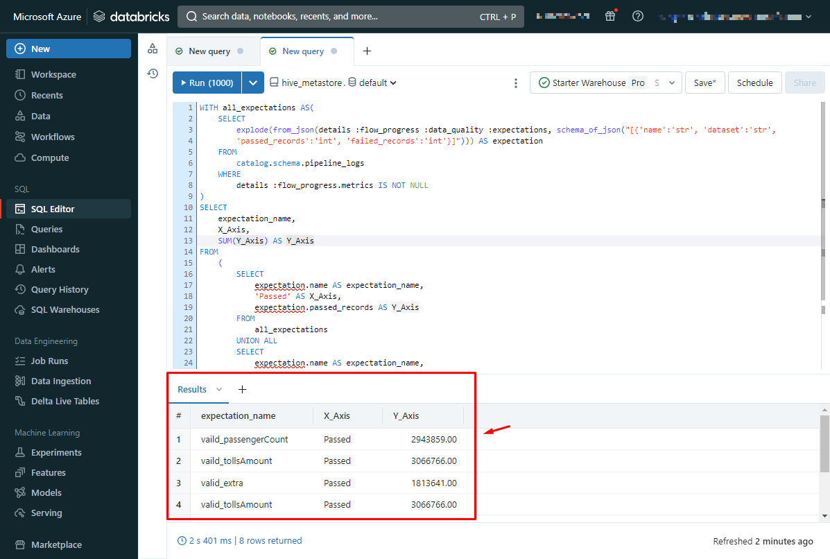 WITH all_expectations AS( SELECT explode(from_json(details :flow_progress :data_quality :expectations, schema_of_json("[{'name':'str', 'dataset':'str', 'passed_records':'int', 'failed_records':'int'}]"))) AS expectation FROM {Table name} WHERE details :flow_progress.metrics IS NOT NULL ) SELECT expectation_name, X_Axis, SUM(Y_Axis) AS Y_Axis FROM ( SELECT expectation.name AS expectation_name, 'Passed' AS X_Axis, expectation.passed_records AS Y_Axis FROM all_expectations UNION ALL SELECT expectation.name AS expectation_name, 'Failed' AS X_Axis, expectation.failed_records AS Y_Axis FROM all_expectations ) GROUP BY expectation_name, X_Axis ; |