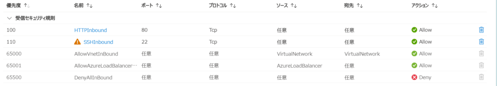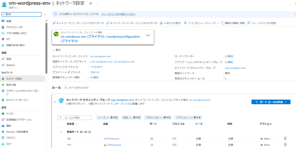 Azure Portal上からも作成を確認できました。ネットワークセキュリティグループも意図したように設定されています。
