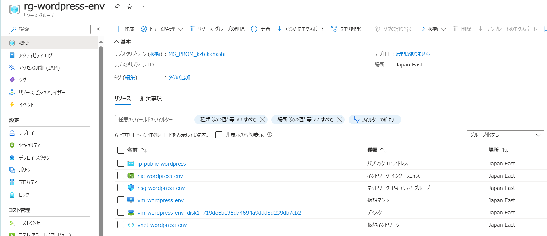 もちろん、リソースグループを始めとした、仮想ネットワーク/サブネット、ネットワークセキュリティグループも含めて、同じタイミングで展開します。