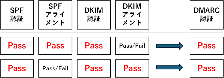 DMARCでは、「SPFまたはDKIMにおいて認証とアライメントがPass」であれば、DMARC認証がPassとなります。