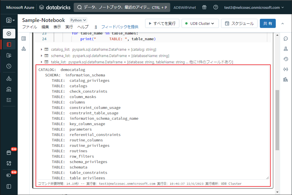 実行後、ユーザーがアクセス権限を持ったテーブル名とビューは、コードの末尾に表示され、該当のカタログとスキーマによって階層化されます。