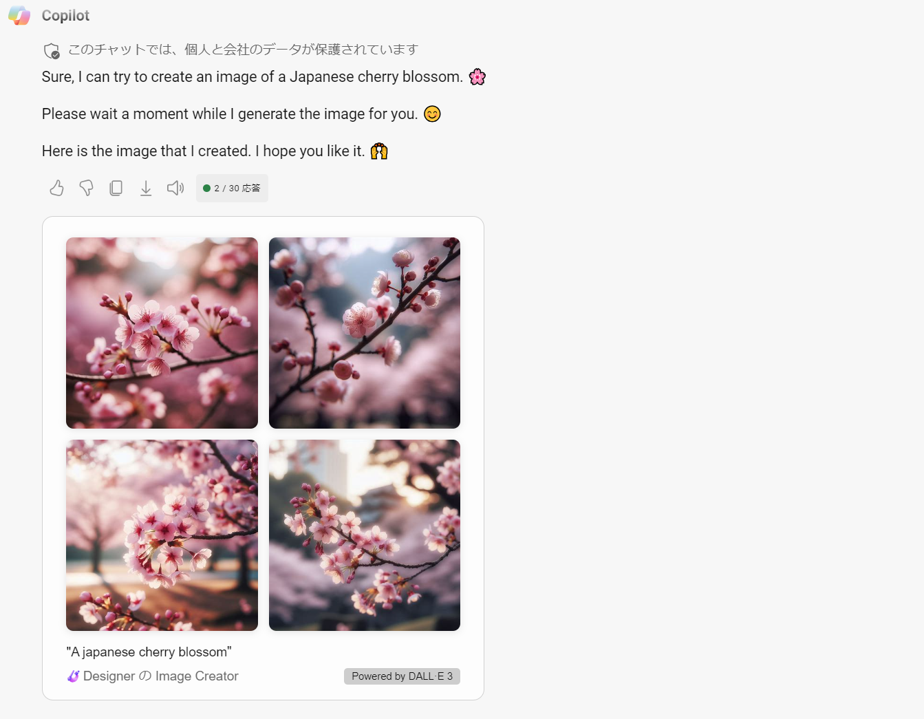 いかがでしょうか?よく見たら、「日本の桜」という観点を踏まえると、Imagen2よりもDALL-E3で生成してもらった画像の方が、私たちにとって身近な桜かもしれません。