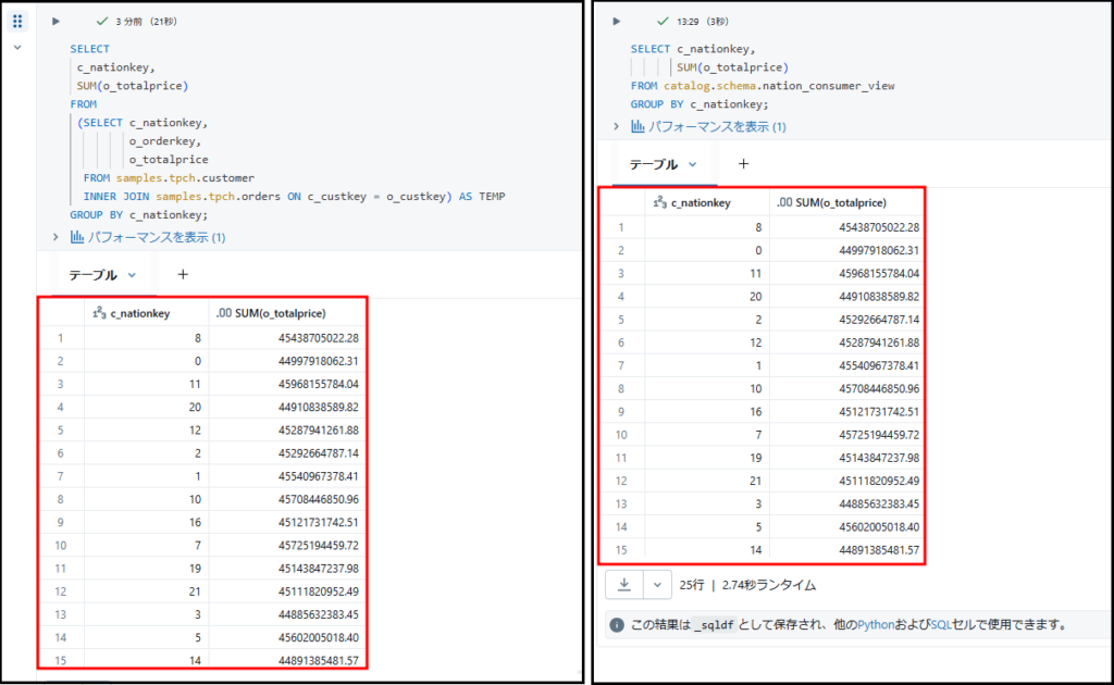 SELECT c_nationkey, SUM(o_totalprice) FROM catalog.schema.nation_consumer_view GROUP BY c_nationkey; |