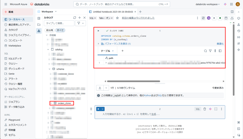 「orders_clone」テーブルの「o_custkey」列に対して Z-order インデックスを実行します。
