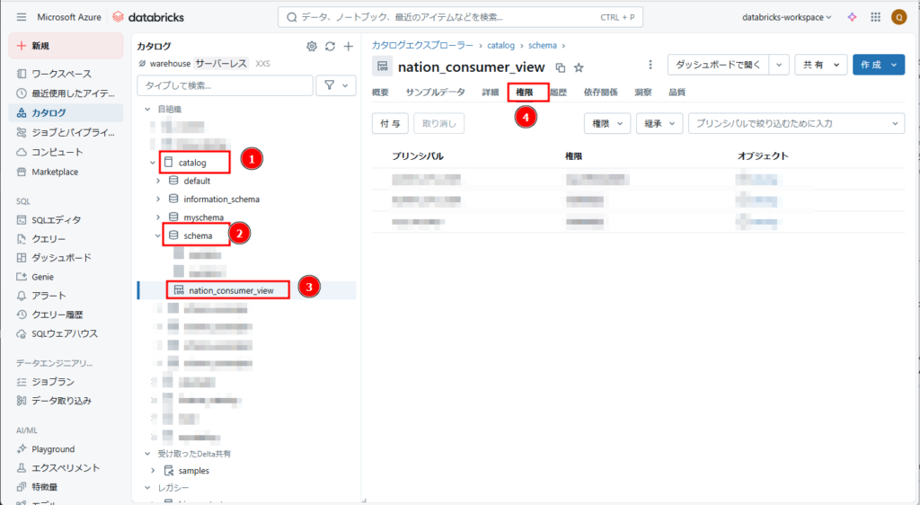 Catalog explore タブに移動する > Catalog > Schema > VIEWを開く。VIEWの概要メニューで「権限」タブにアクセスします。