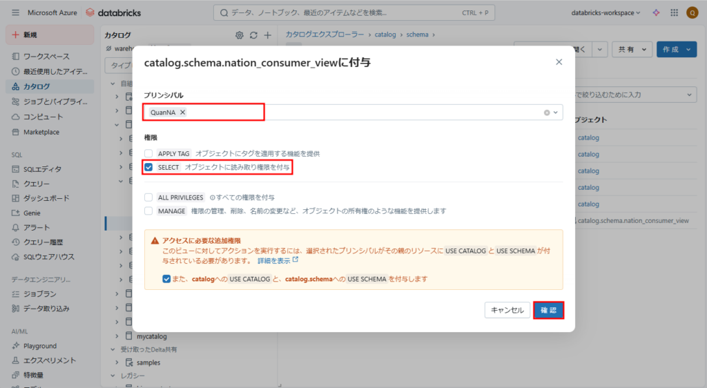 ・ユーザーはカタログの USE CATALOG 権限、およびスキーマの USE SCHEMA 権限を有している必要があります。