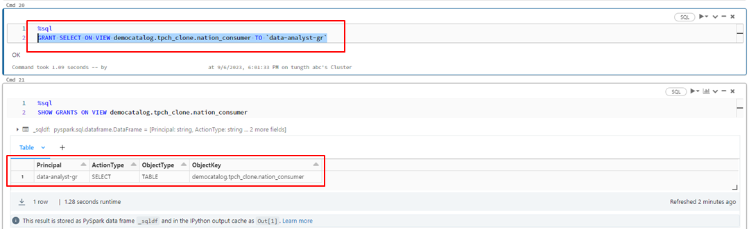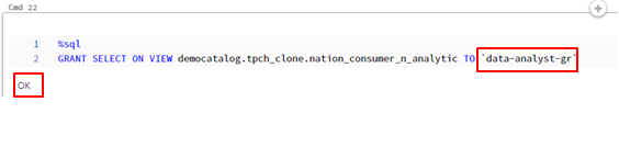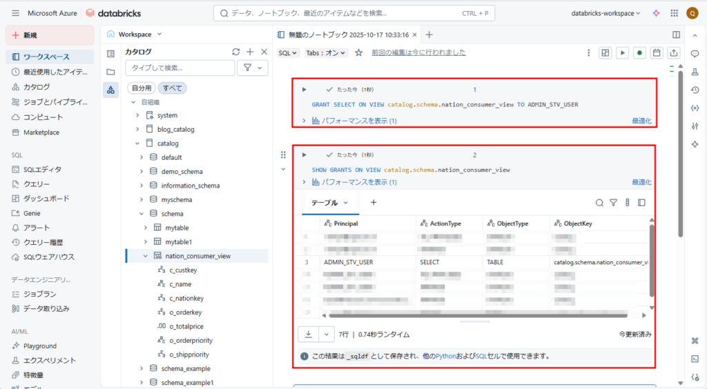 以下のコマンドを実行して、Databricks workspaceでVIEWのアクセス権限を割り当てします。