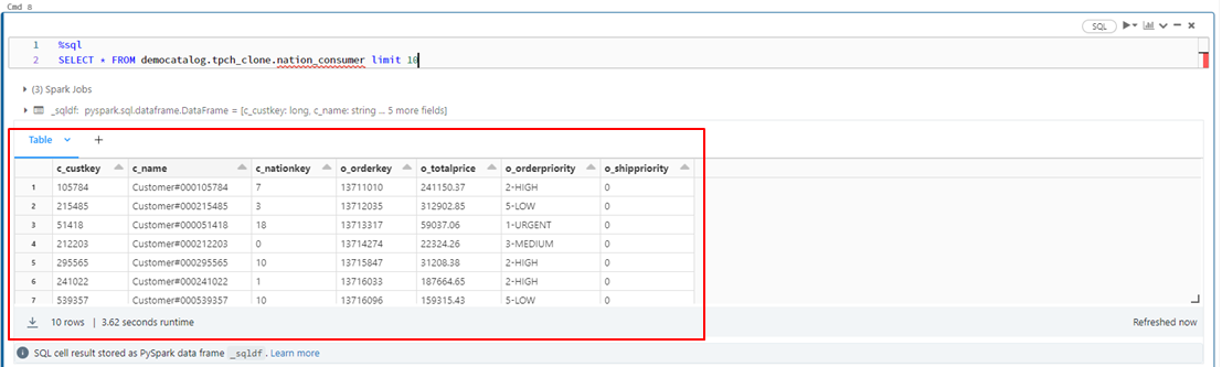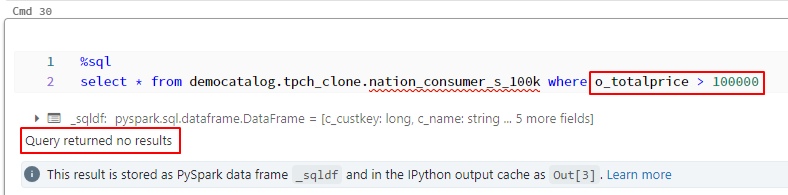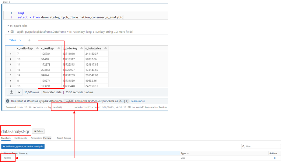 以下のコマンドを実行して、「data-analyst-gr」のユーザーに対して「c_custkey」カラムの値を確認します。