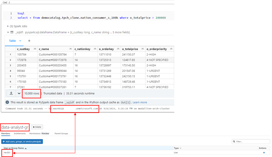 「data-analyst-gr」ユーザーである場合、合計金額の100000以上の行が表示されます。