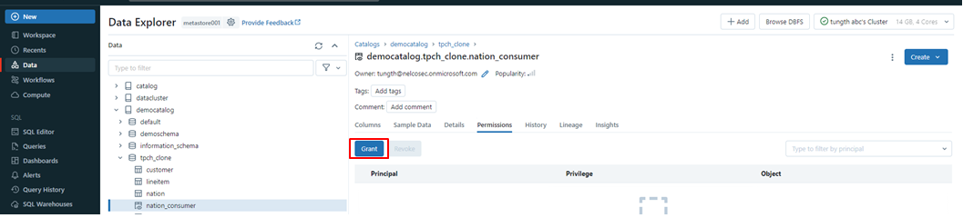 Data explore タブに移動する  >  Unity Catalog > Schema > VIEWを開く。VIEWの概要メニューで「Permission」タブにアクセスします。