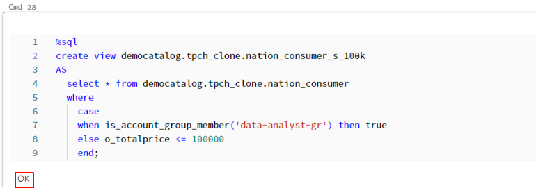以下の例では 合計金額の100000以上の行が「data-analyst-gr」ユーザーのみに表示されます。