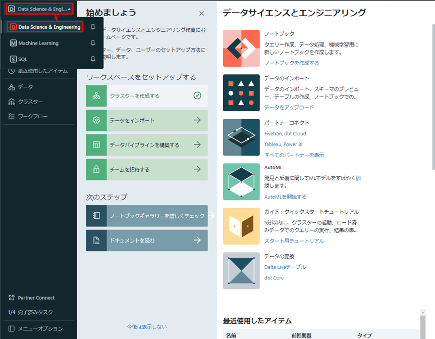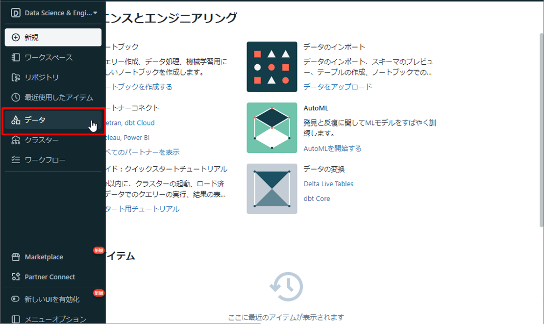 ② Databricks画面でサイドバーから「Data science & Engineering」をクリックします。