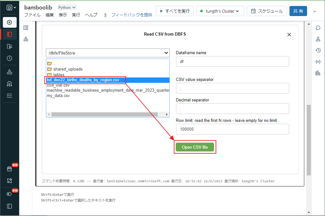 ②「Read CSV from DBFS」ダイアログボックスで、前の手順で DBFS にアップロードした csv ファイルを選択し、「Open CSV file」ボタンをクリックします。