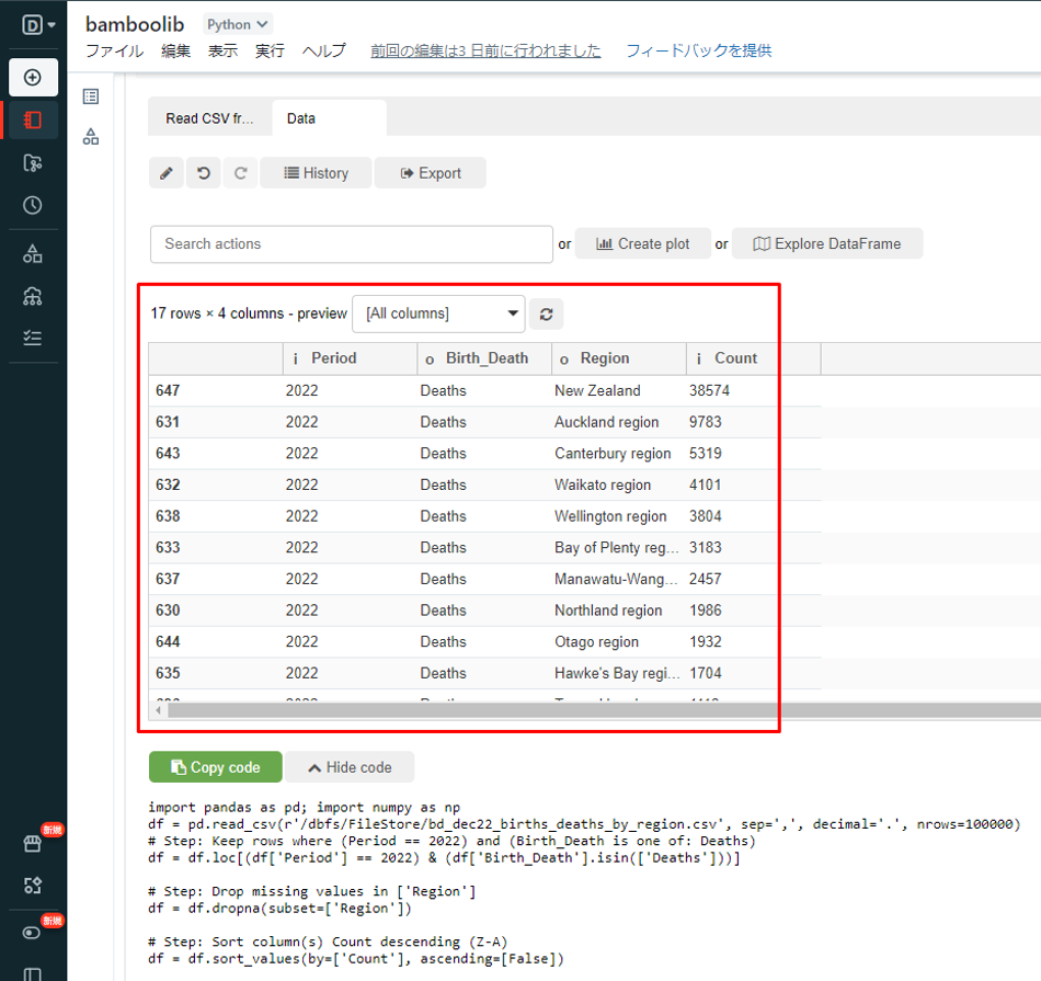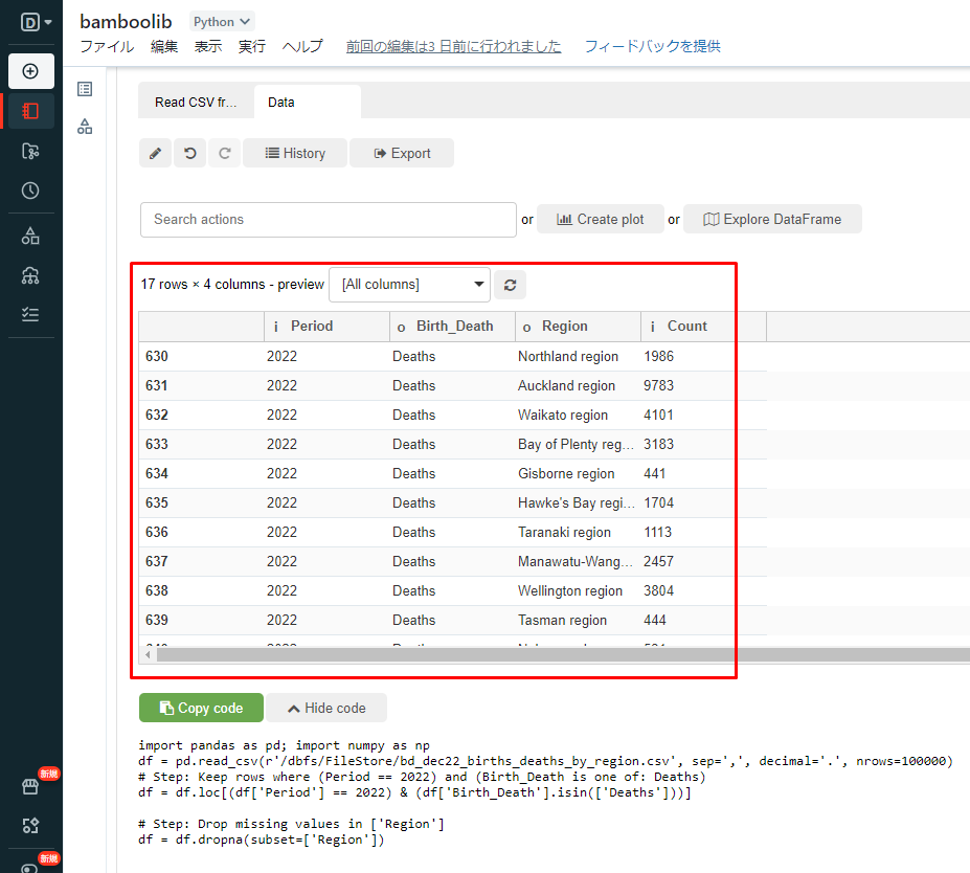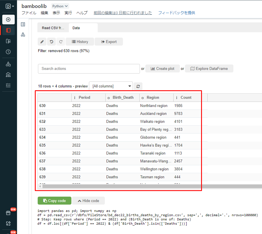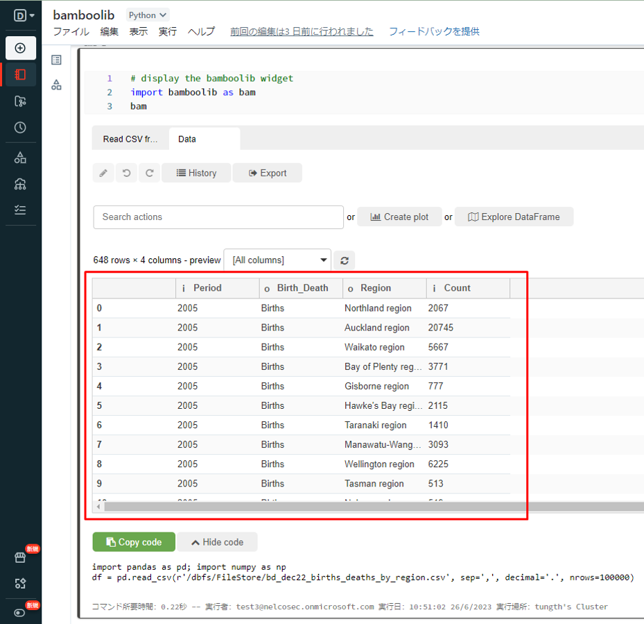 ① 以下のコードをコピーしてデータを表示して、ノートブックで実行します。