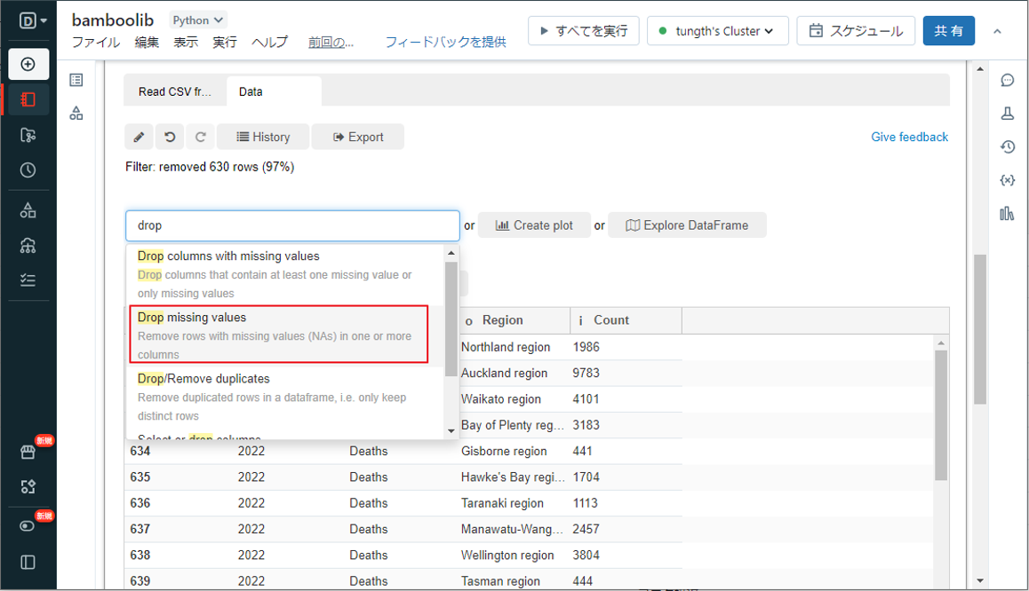 特定のカラムに欠損値がある行を削除したい場合(例えば、このデータセットでは「Region」カラムに欠損値の行を削除したい)、「Data」タブの「Search actions」ドロップダウンリストで以下の手順に従ってください。