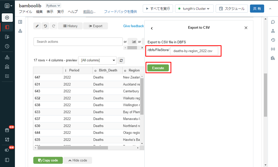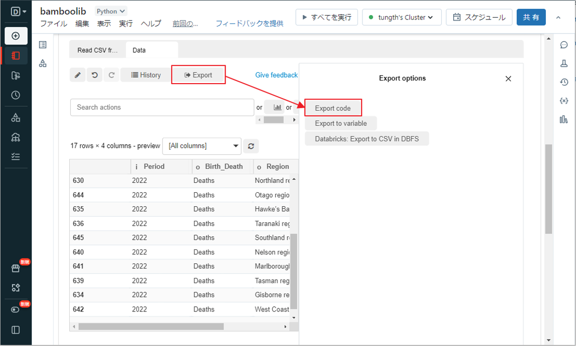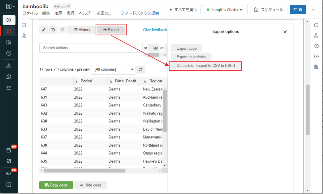 ①「Export」をクリックして「Databricks: Export to CSV in DBFS」をクリックします。